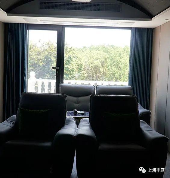 1.影音室后方有一個(gè)陽(yáng)臺(tái),采用隔音玻璃和厚窗簾的解決方案,解決了采光與影音空間的出入。
