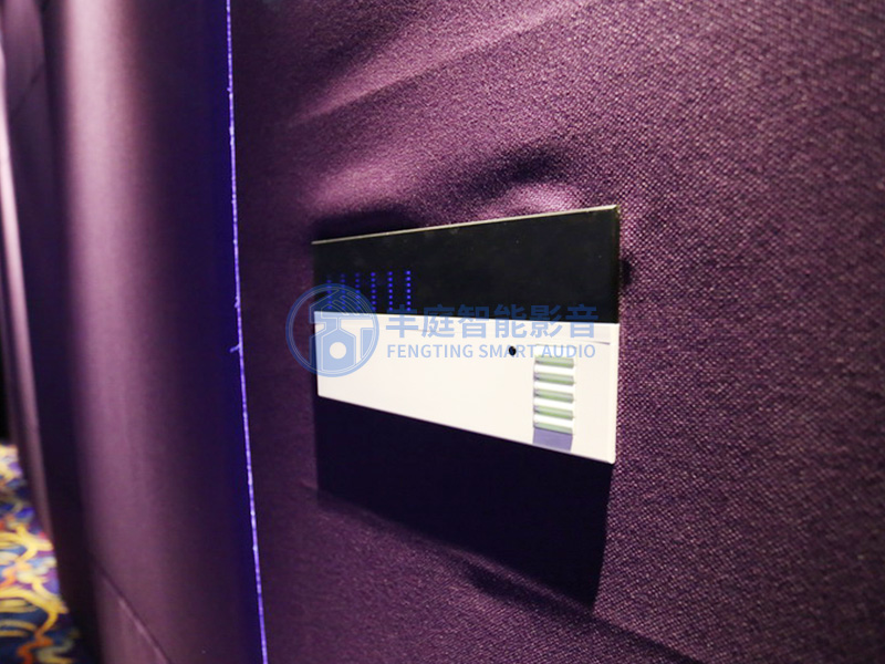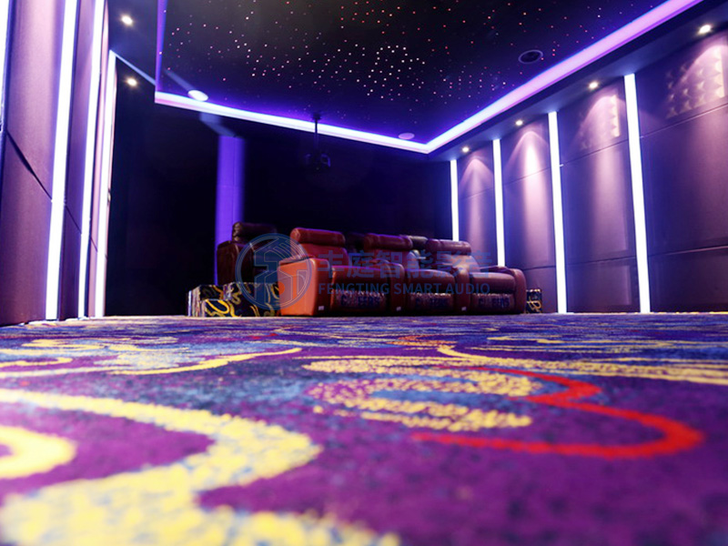 音頻采用全景聲7.3.4設計,考慮到低頻的體感,后排沙發單獨配置了一臺密閉炮,同時地臺按照木質結構打造,同時考慮到前后排的聲壓覆蓋,6.5米的試聽距離,影院前三采用的是james的定制安裝系列808be,寬廣的中高頻銜接,既保證高頻透過幕布的后的聲壓級,又讓聲音不刺耳耐聽,為了充分抵消駐波,前墻用了兩只12寸低音炮,配合后墻炮既滿足體感,也讓低頻更干凈。