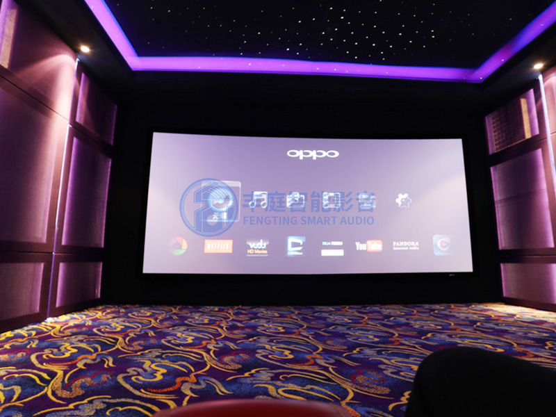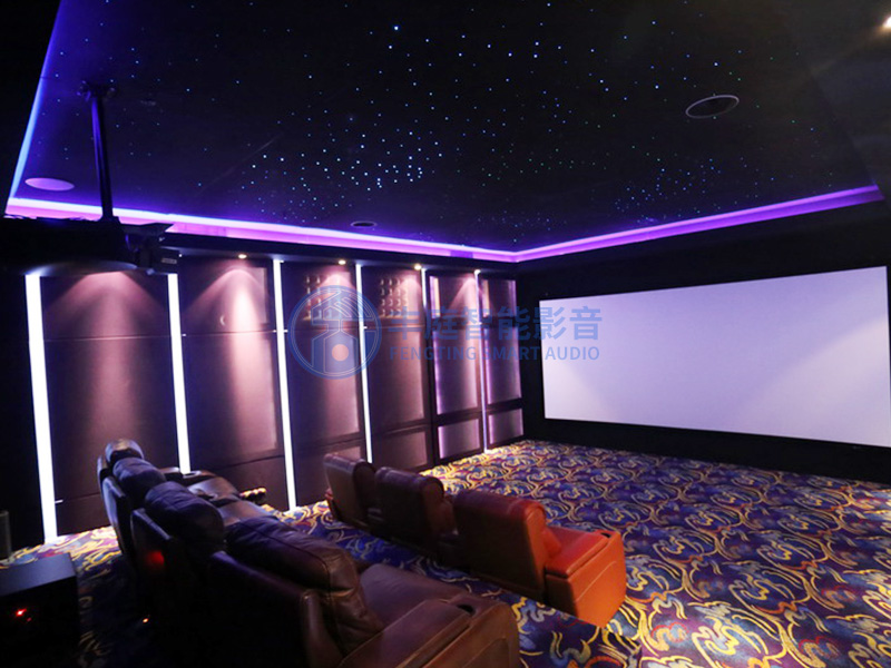 結合前墻寬度以及兩排沙發觀影距離的觀影舒適度,設計之初考慮了200寸2.35:1的寬熒幕,這也是好萊塢電影的拍攝比列標準,同樣為了消除環境的光污染,四個墻面做的都是深顏色的透聲布修飾,頂面星空頂吸光設計,尤其是吸頂的揚聲器都按照磨砂黑定制,投影選擇了jvs的的n8,經過isf專業視頻調后,黑位深沉,亮部飽滿色彩準確