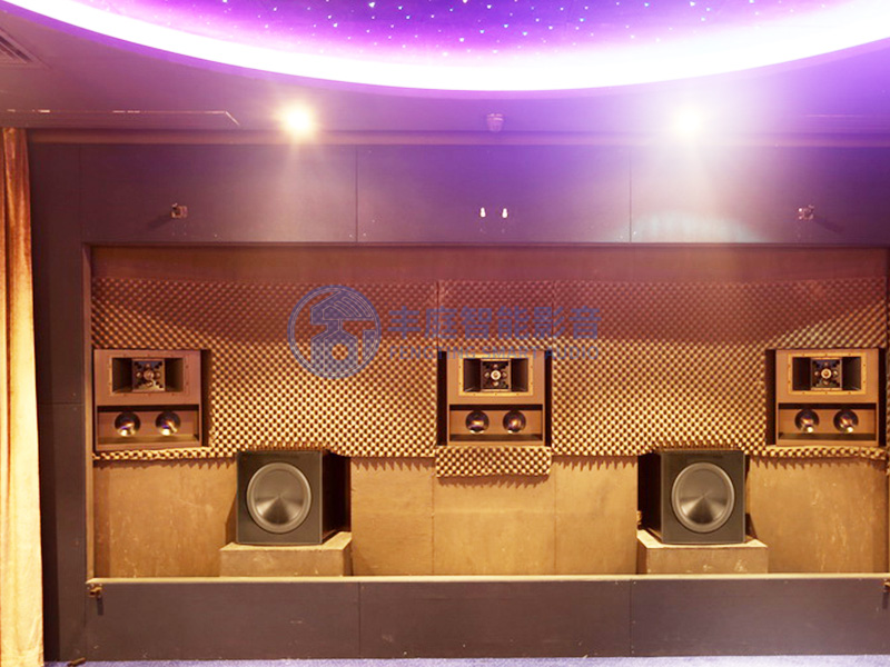我們把幕布拿下來就能到整個音頻系統(tǒng),整套音頻系統(tǒng)采用全景聲7.4.4全景聲設計,考慮到前后排的聲壓覆蓋,影院前三采用的是james系列mq84,矩陣高音是一大特色,既保證高頻透過幕布的后的聲壓級,又讓聲音不刺耳耐聽,為了充分抵消駐波,前墻兩只低音炮按照模擬位置拜訪,炮位根據(jù)實際數(shù)據(jù)分析,將后座抬高到0.8米,充分抵消長度方向的二次駐波,同時,后墻配合兩只密閉炮將整個低頻聲場分布的更加平衡。