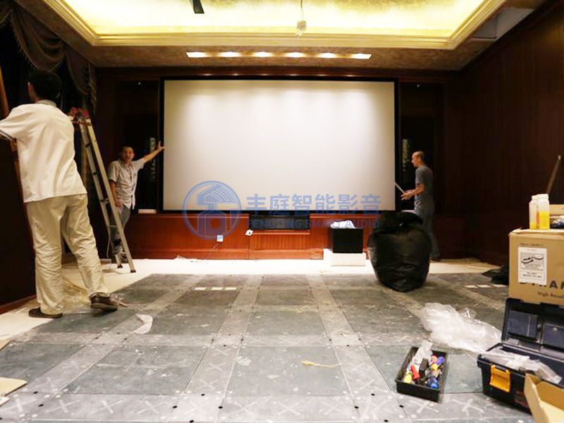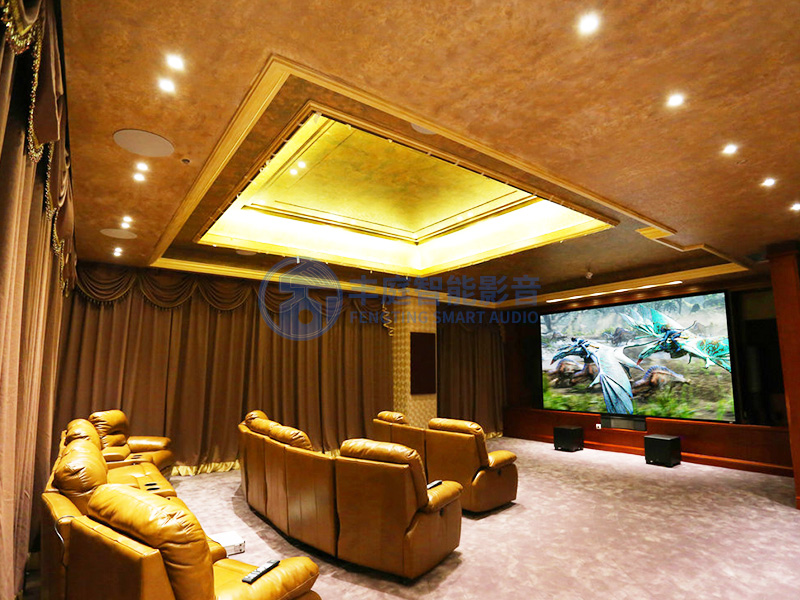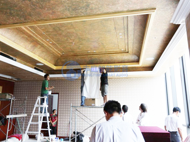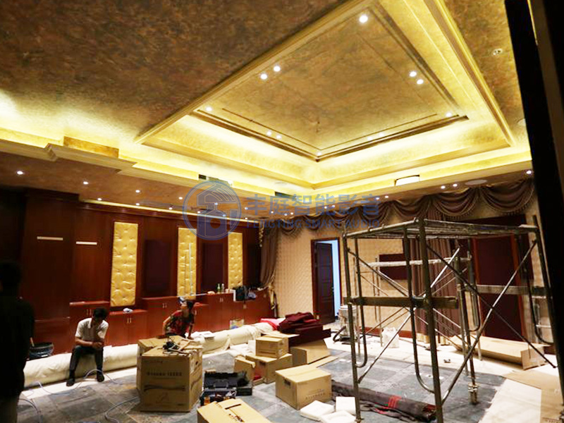 房間的原始層高高度良好,在吊頂深度足夠的前提下,為了手繪油畫裝飾頂面的美觀以及整體協調性,投影機選擇了隱藏式安裝。為了得到良好的亮度反饋和實際觀感,選擇了大尺寸熒幕配合高增益幕料。而在保證觀看距離的前提下,前方三個音箱選擇了隱藏式安裝,保證前墻裝飾面的整齊美觀。